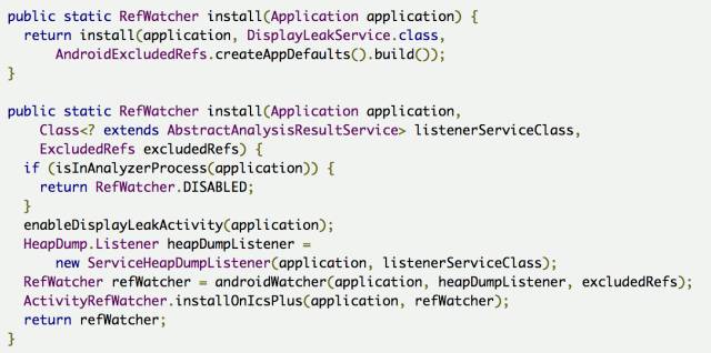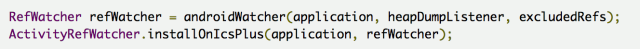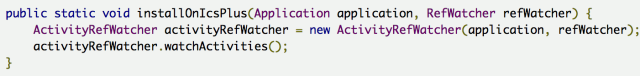 先生成了一个RefWatcher,这个东西非常关键,从名字可以看出,的英文它用来watch Reference的,也就是用来一个监控引用的工具。再把然后 refWatcher状语从句:我们自己提供的application传入到ActivityRefWatcher.installOnIcsPlus(application, refWatcher);这句里面,继续看。
