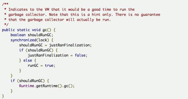 注释里清楚说了,只是System.gc()建议垃圾回收器来执行回收,但是 不能保证真的去回收,从代码也能看出,必须先判断shouldRunGC才能决定是否真的要gc。