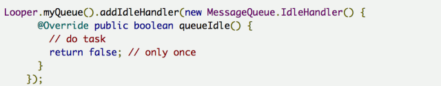 换句话说,IdleHandler就是 优先级别较低的 Message,只有当Looper没有消息要处理时才得到处理。而且,内部的 queueIdle()方法若返回true,表示该任务一直存活,每次Looper进入 Idle时就执行;反正,如返回 false,则表示只会执行一次,执行完后丢弃。