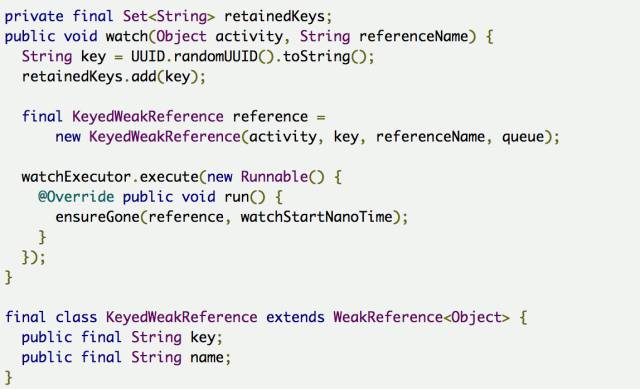 AndroidWatchExecutor会在5秒后,开始检查这个弱引用内的Activity。是否被正常回收判断条件是:若 Activity被正常回收,那么引用它的KeyedWeakReference会被自动放入的ReferenceQueue中。