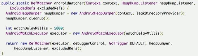 这里面涉及到两个新的对象:AndroidHeapDumper和AndroidWatchExecutor,前者用来转储内存状态的,后者则是用来观看一个引用的监听器。具体原理后面再看。总之,这里已经生成好了一个 RefWatcher对象了。