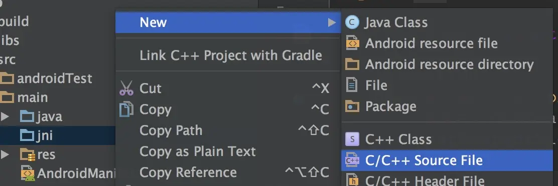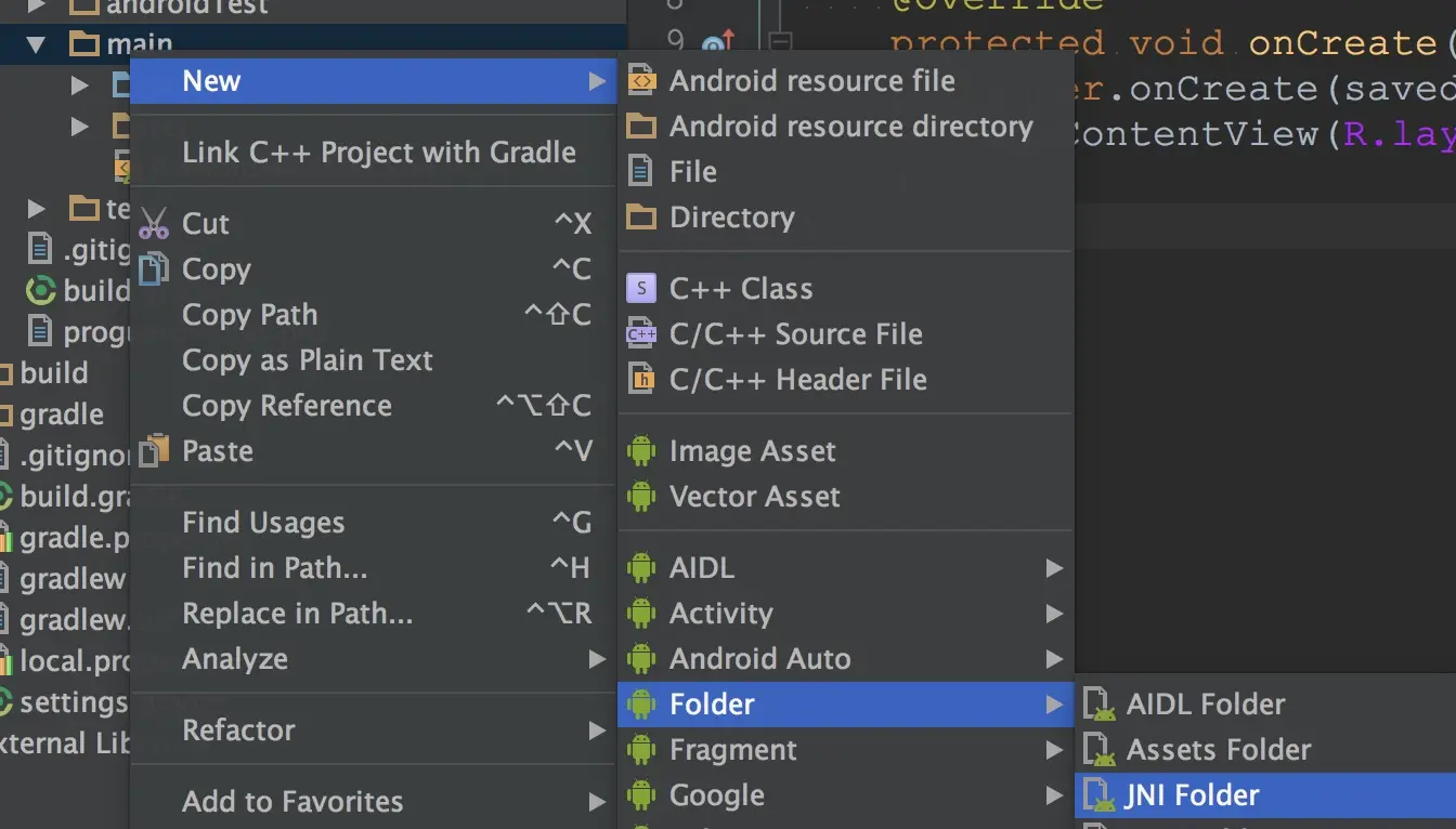 这种方式比上一中又简化了很多,无需再自己编写 Android.mk 了,但原理都是一样的。 1、在 main 下新建 jni 目录,如图:
