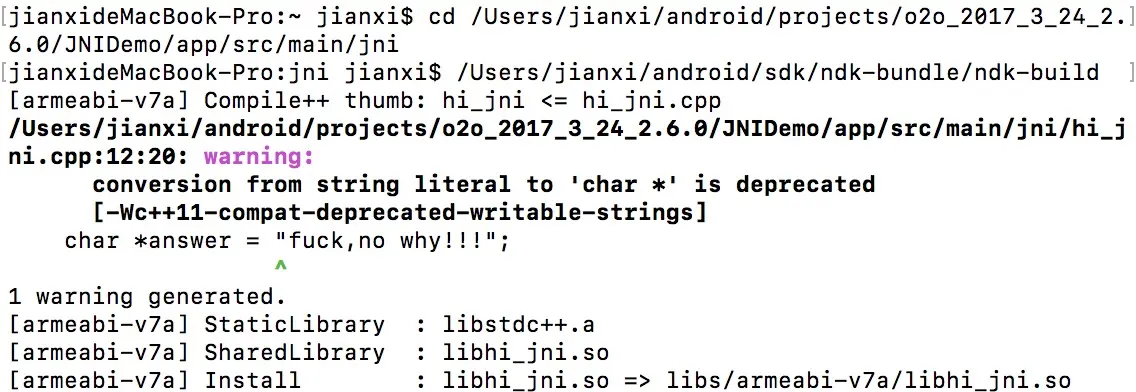 8、在 jni 目录下面打开命令行工具,然后执行 ndk-build ,即可在 libs 目录下得到产物: