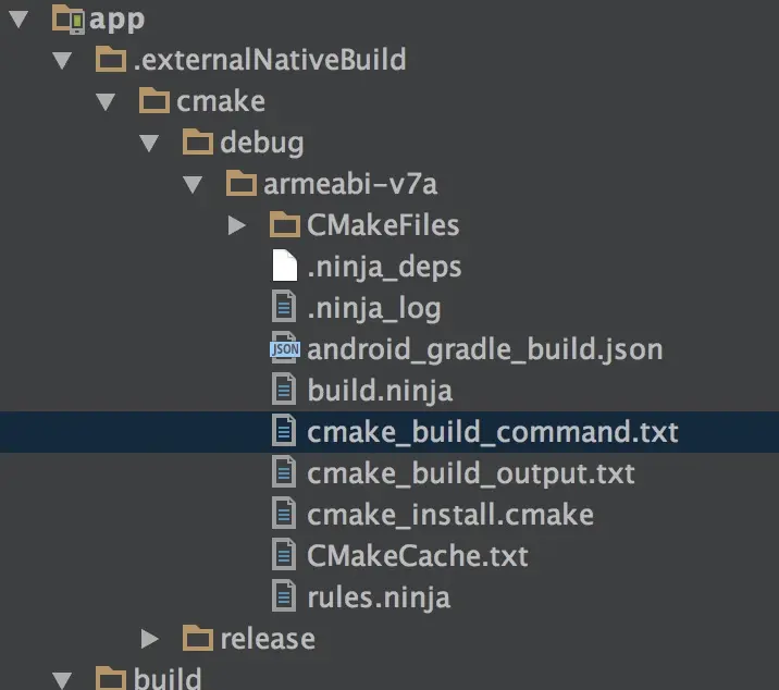 Executable : /Users/jianxi/android/sdk/cmake/3.6.3155560/bin/cmake arguments : -H/Users/jianxi/android/projects/o2o_2017_3_24_2.6.0/x264test1/app -B/Users/jianxi/android/projects/o2o_2017_3_24_2.6.0/x264test1/app/.externalNativeBuild/cmake/debug/armeabi-v7a -GAndroid Gradle - Ninja -DANDROID_ABI=armeabi-v7a -DANDROID_NDK=/Users/jianxi/android/sdk/ndk-bundle -DCMAKE_LIBRARY_OUTPUT_DIRECTORY=/Users/jianxi/android/projects/o2o_2017_3_24_2.6.0/x264test1/app/build/intermediates/cmake/debug/obj/armeabi-v7a -DCMAKE_BUILD_TYPE=Debug -DCMAKE_MAKE_PROGRAM=/Users/jianxi/android/sdk/cmake/3.6.3155560/bin/ninja -DCMAKE_TOOLCHAIN_FILE=/Users/jianxi/android/sdk/ndk-bundle/build/cmake/android.toolchain.cmake -DANDROID_NATIVE_API_LEVEL=14 -DCMAKE_CXX_FLAGS= jvmArgs :