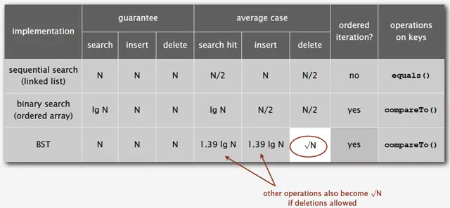 对于插入来说,只需要常数次操作即可完成,因为他只需要修改与该节点关联的节点即可,不需要检查其他节点,所以效率和查找类似。下面是2-3查找树的效率: