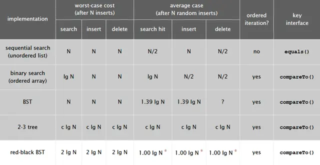 下图是红黑树在各种情况下的时间复杂度,可以看出红黑树是2-3查找树的一种实现,它能保证最坏情况下仍然具有对数的时间复杂度。