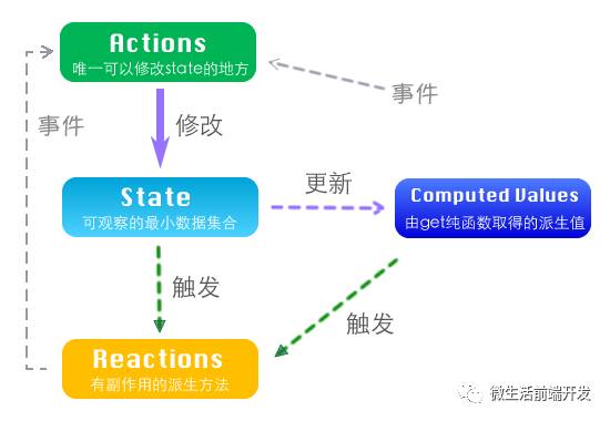 | 派生 | 从核心数据中引发的数据或动作,比如下面提到的computed和reaction |