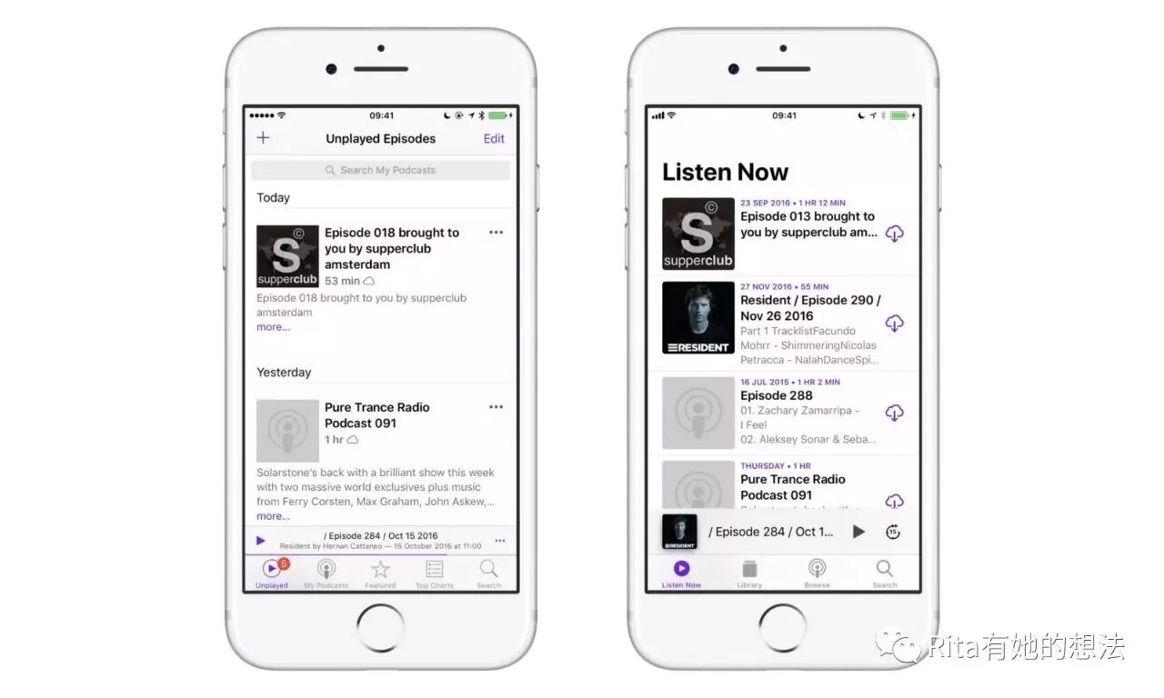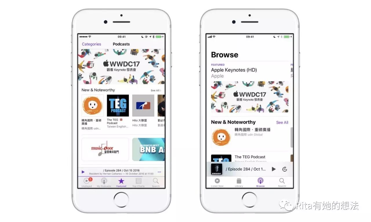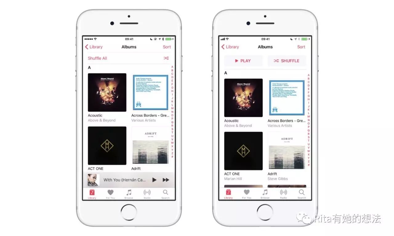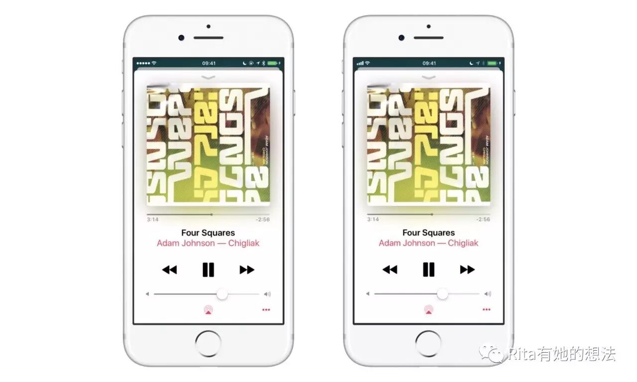横向的 Tab bar 排列方式有改变(上新下旧),争取更多垂直空间。这个设计在 iOS 10 的 iPad 版本「音乐」App 就有了,只是应用到了 iPhone 上。