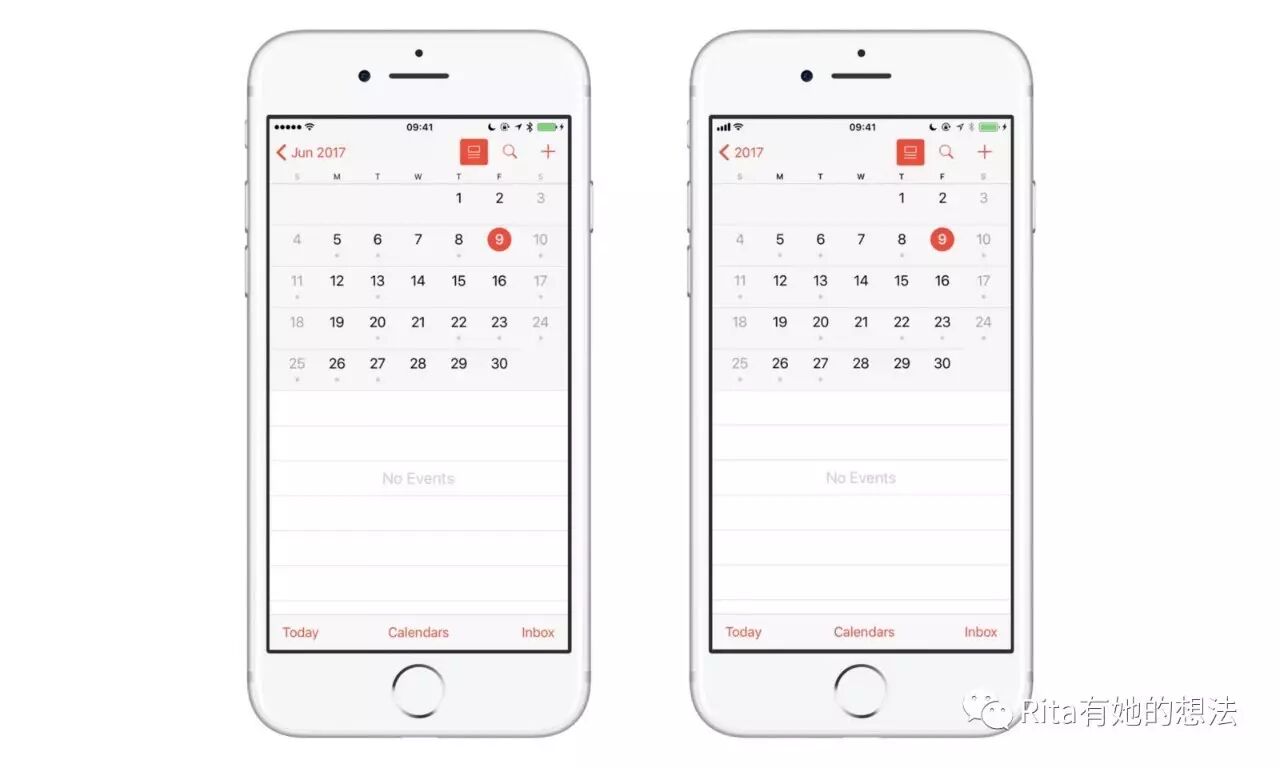 这个画面左上角的「Jun 2017」变成「2017」,原本以为是 feature,因为把 nav button 当成 nav title 用不太合理;但经网友指出,这样以来会变成没有显示当前月份,易造成混淆。我觉得挺有道理的,苹果应该不会为了改善一个缺点而制造更多缺陷,因此想一想是 bug 的可能性较大。
