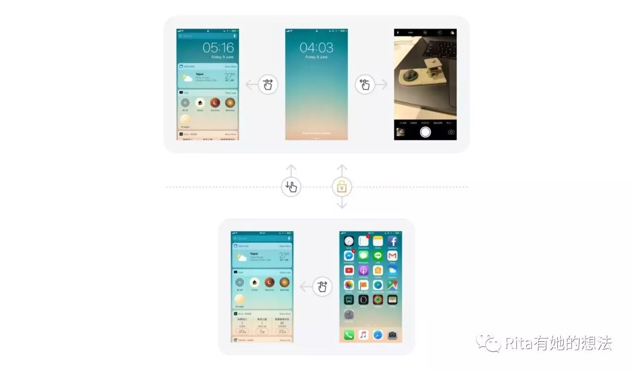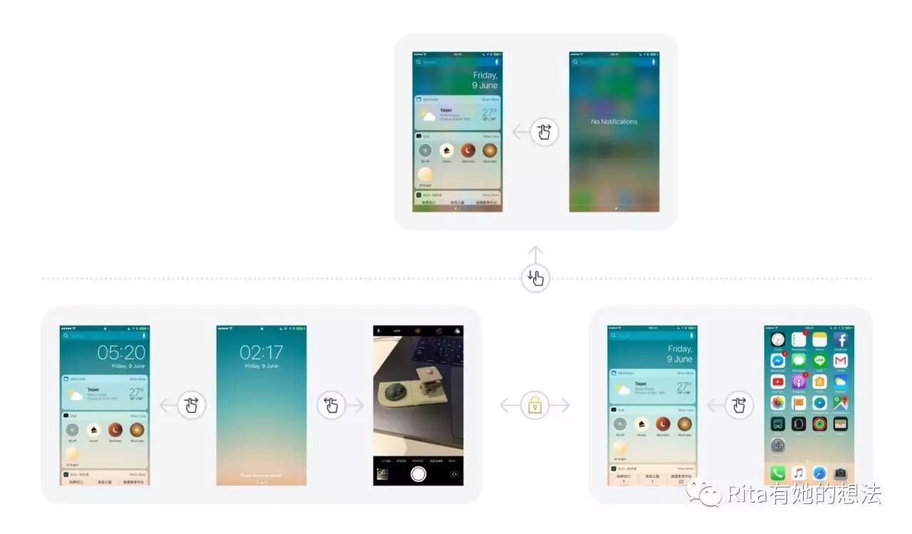 从 iOS 7 到 iOS 10 以來,随着功能的增加,锁定画面、主画面、通知中心这三者的结构越来越复杂 ,其中的操作逻辑和视觉线索就产生了明显的矛盾,例如下面這是 iOS 10 的主画面结构: