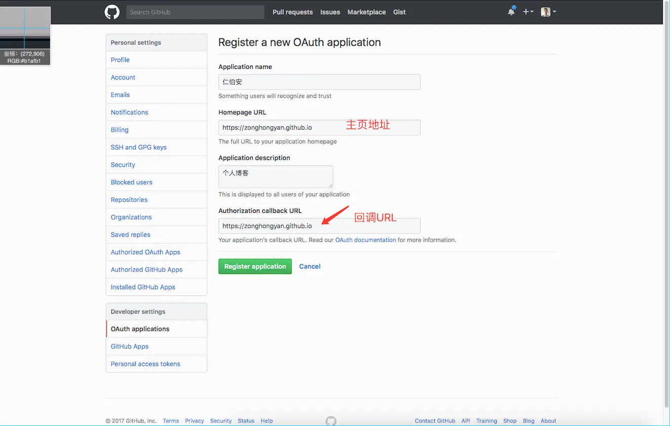 Gitment是使用的GitHub Issues作为评论系统,在接入Gitment前,需要获得GitHub的授权,获得相应的客户端id和客户端私钥,以备站点使用。具体步骤如下图所示: