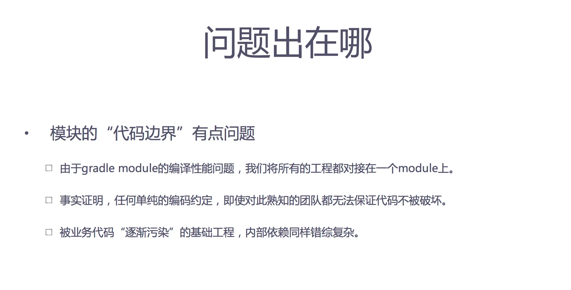 最后就是代码的边界模糊,模块之间没有很好的代码约束。