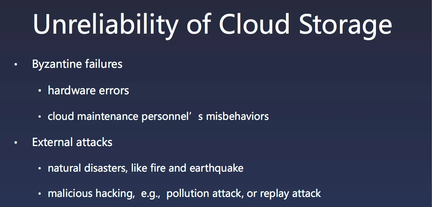 尽管将数据外包到云服务有诸多优势,但客户门,尤其拥有敏感数据的客户们,如政府部门、银行等,对云计算的数据外部提出诸多要求。他们需要非常可靠的数据存储服务。