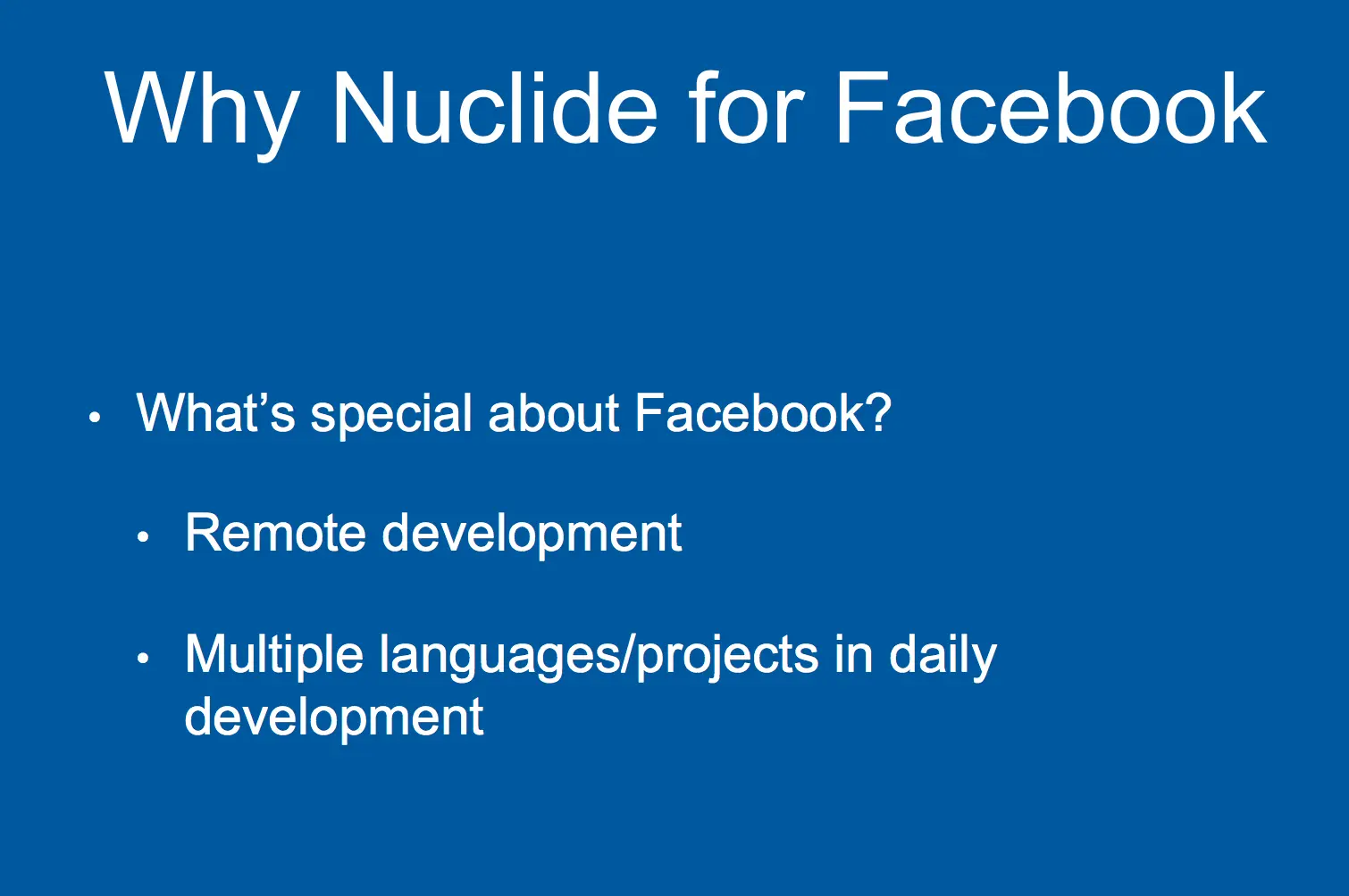 又去听了一场Facebook的分享,基本将全部Facebook的分享都听完了。这次带来的是他们自己开发的代码开发工具,Nuclide。