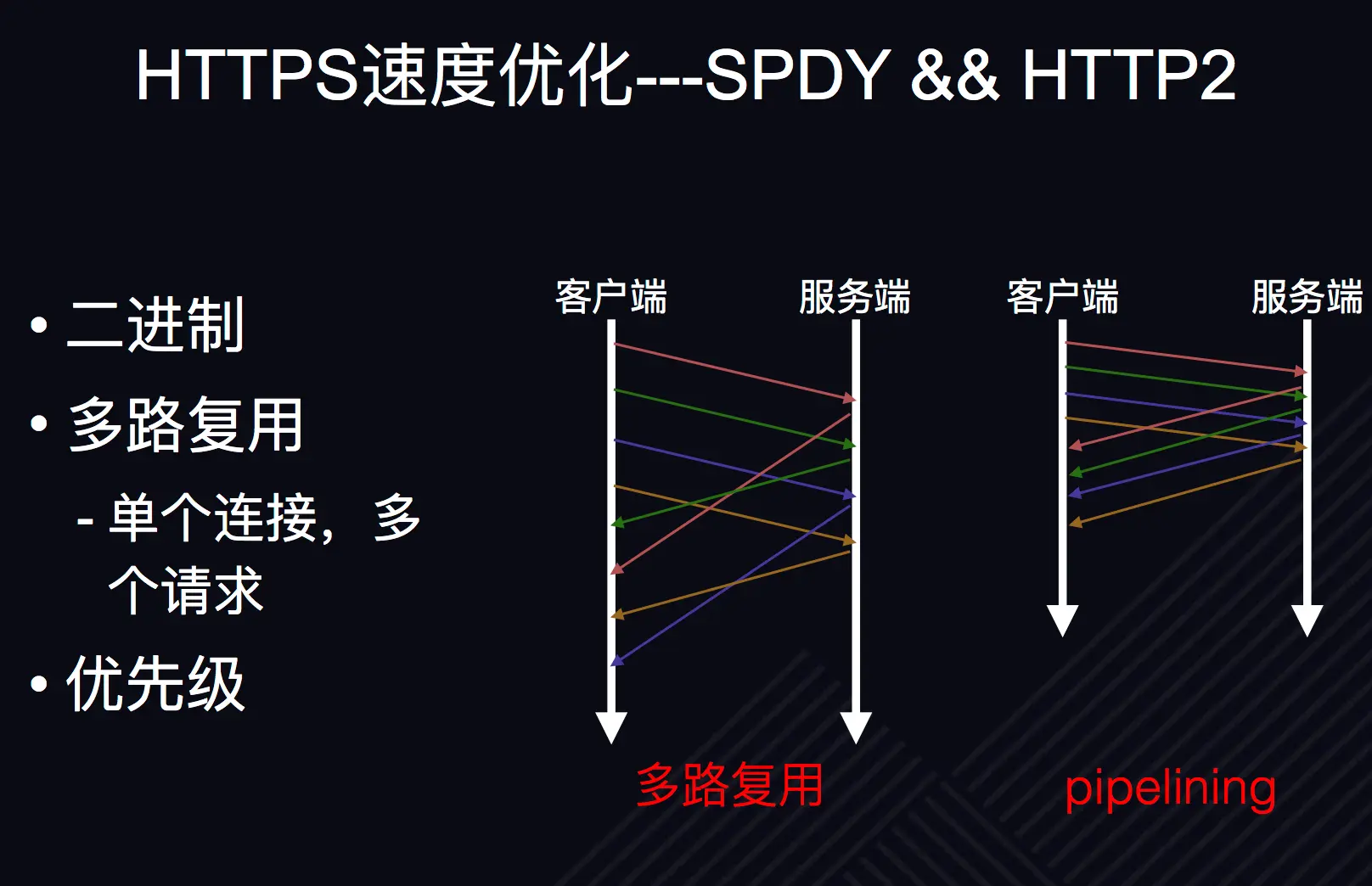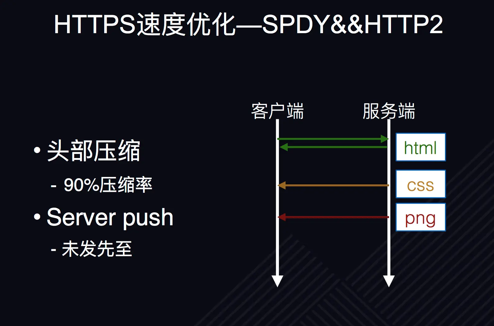 SPDY算是HTTP2的先驱,大体的优化都一致,除了没有头部压缩以外。