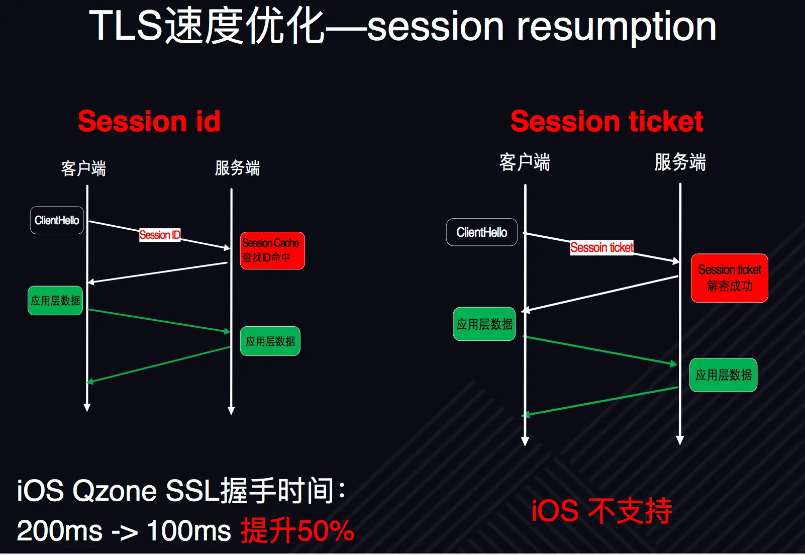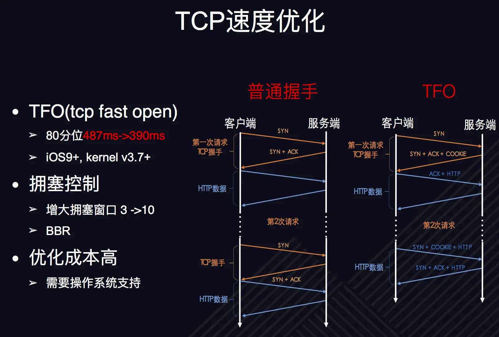 TCP速度优化,可采用TFO,实际上是第二次握手的时候直接带上session, cookie,省掉了一个来回。