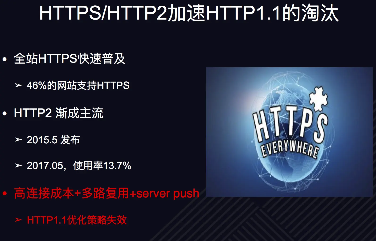 可是,新时代随着HTTPS的普及,HTTP1.1的优化显得不合事宜。逐步被淘汰,HTTP2应运而生。