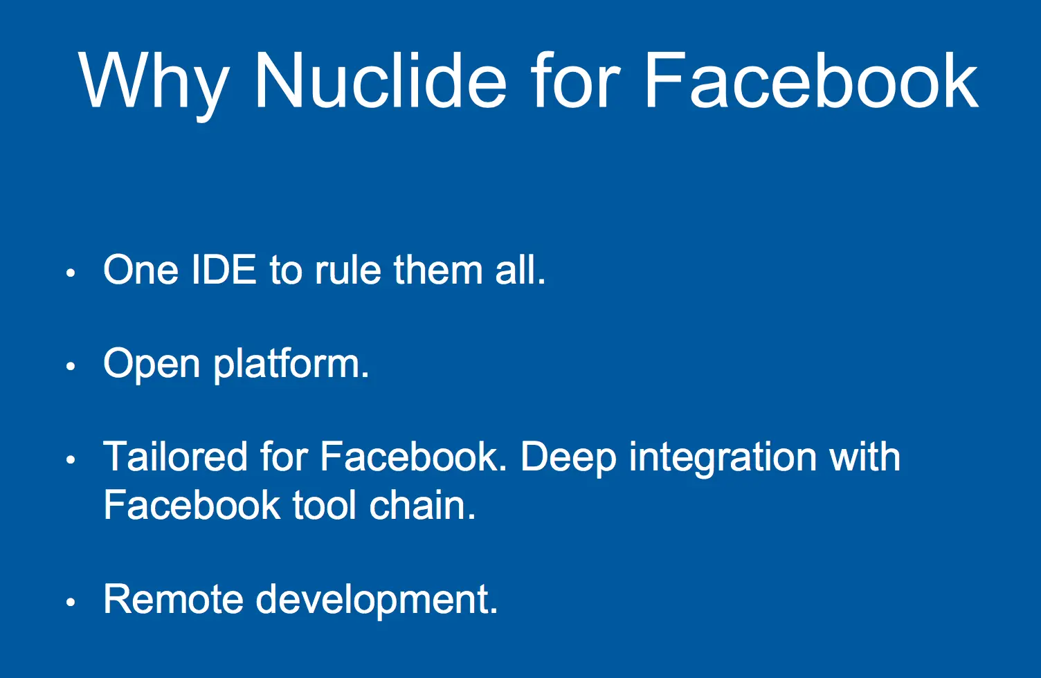 这里讲了Nuclide的一些特色,分别是开源、远程开发、源码版本控制、构建集成、调试等。