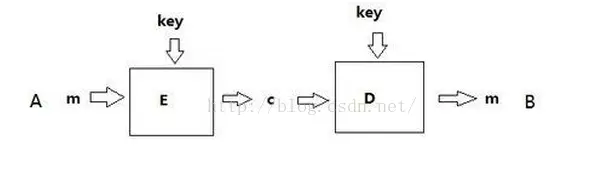 对称加密的核心——通信双方共享一个密钥 通信过程: A有明文m,使用加密算法E,密钥key,生成密文c=E(key,m); B收到密文c,使用解密算法D,密钥key,得到明文