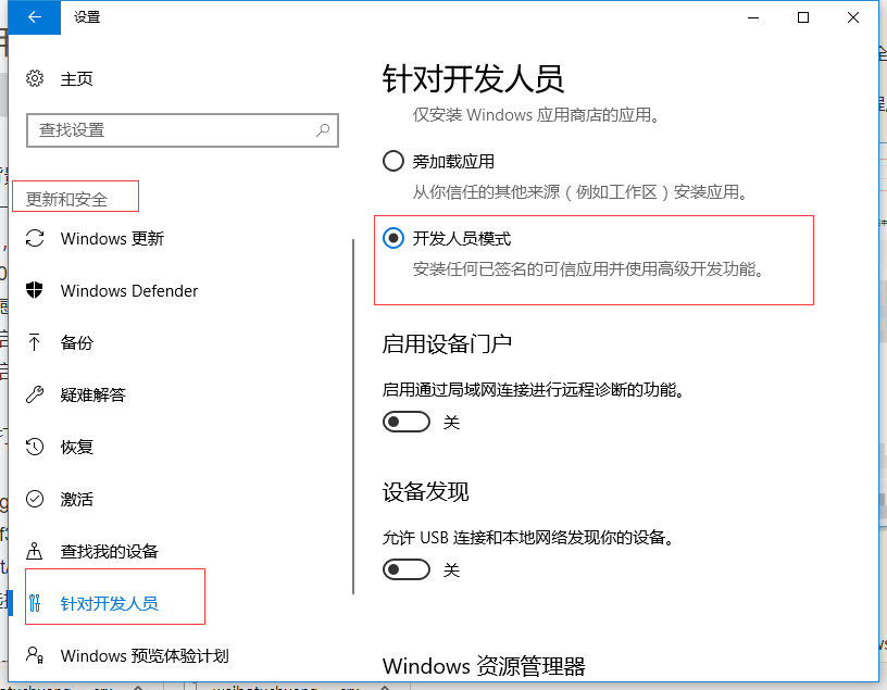 1.启用 设置- 更新和安全-针对开发者人员-选择开发者模式