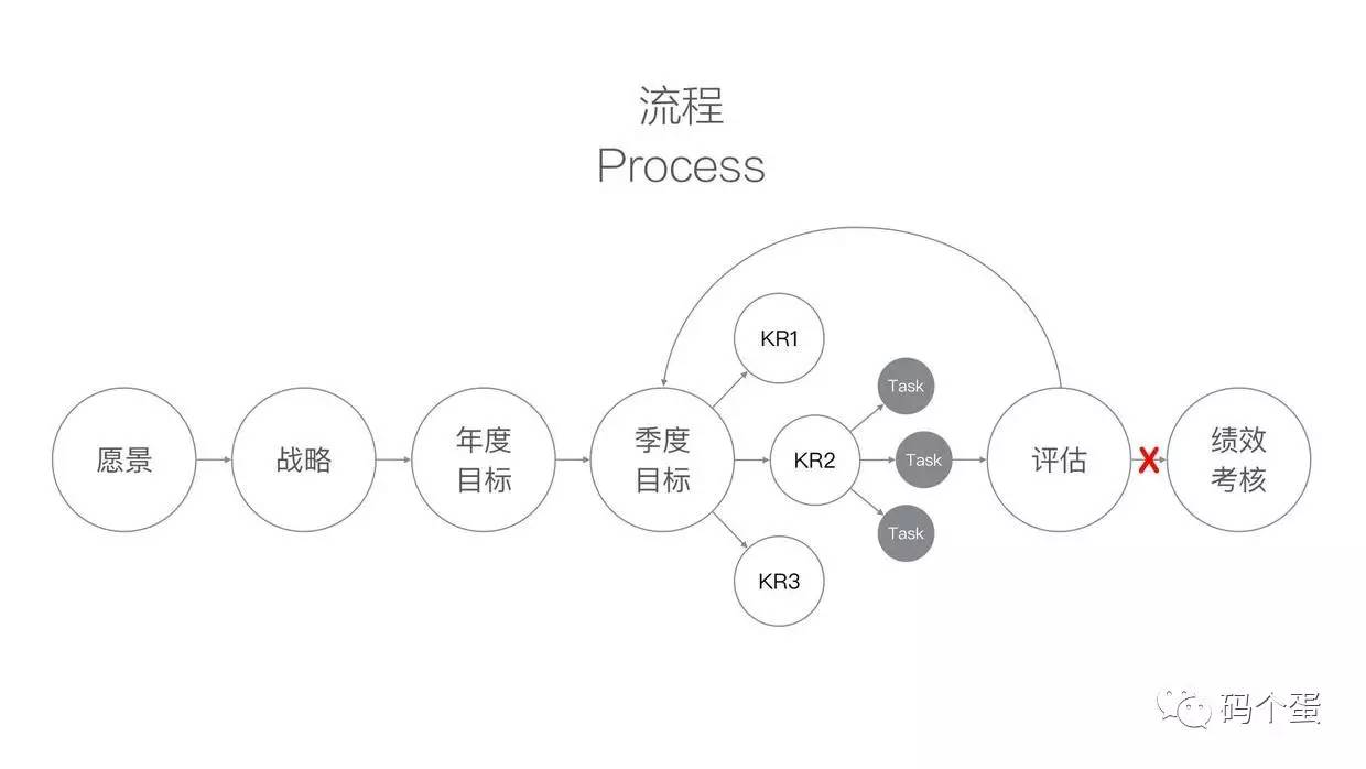 OKR不是绩效考核工具。为什么评估完了,不要考核呢?这是为了保证执行的过程不出现畸形,保证结果是真实的。据说某个互联网巨头出过这样的笑话,就是一个产品经理为了完成PV的KPI,故意把可以用一个按钮完成的,改成两个按钮,结果当然是拿到了奖金,但结果却不是我们想要的。因此为了避免目标负责人因短期个人利益而损害目标效果的情况出现,OKR不要绩效考核,尤其是不能有具体的奖惩。