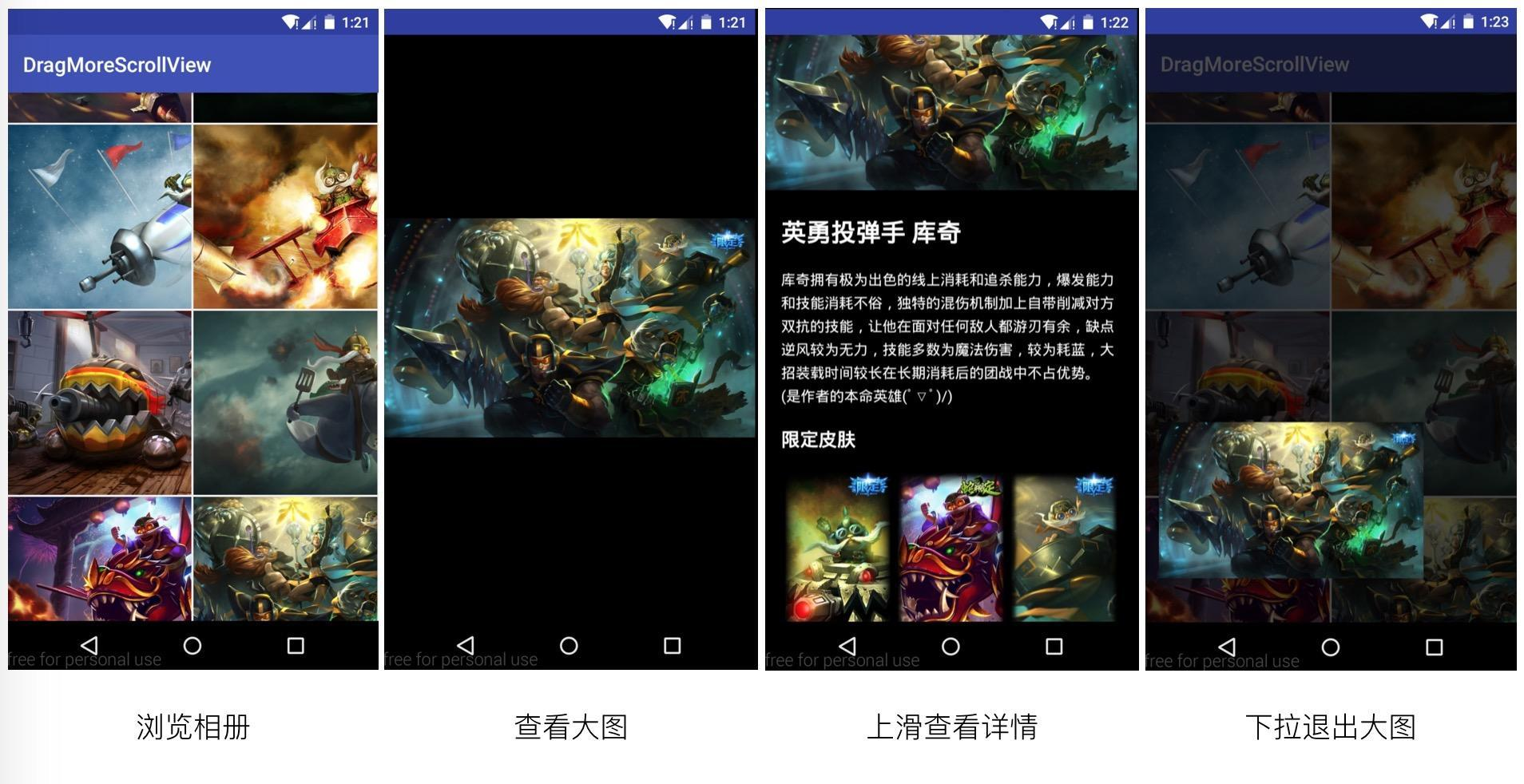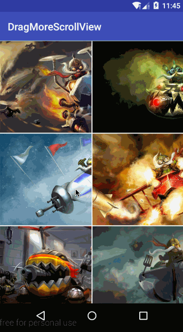 ok,知道了ScrollView的滑动机制后,我们可以重写它的onOverScrollBy方法,当处于浏览图片状态下时,我们通过消费掉该方法的deltaY来拦截ScrollView的滑动,从而让我们自己来掌控滑动的效果(例如下滑退出大图),当上滑进入详情时,我们又将滑动交付给ScrollView自己去完成