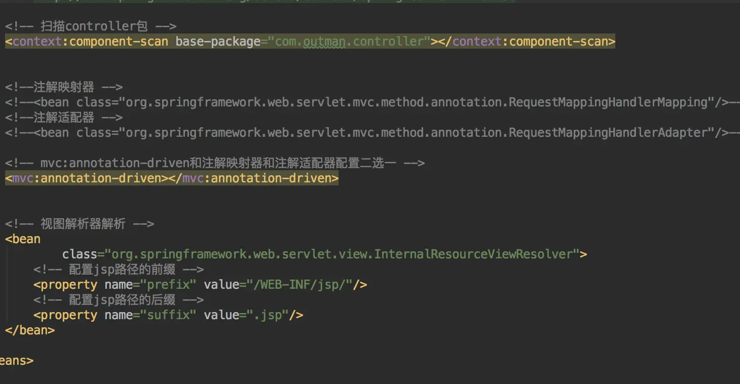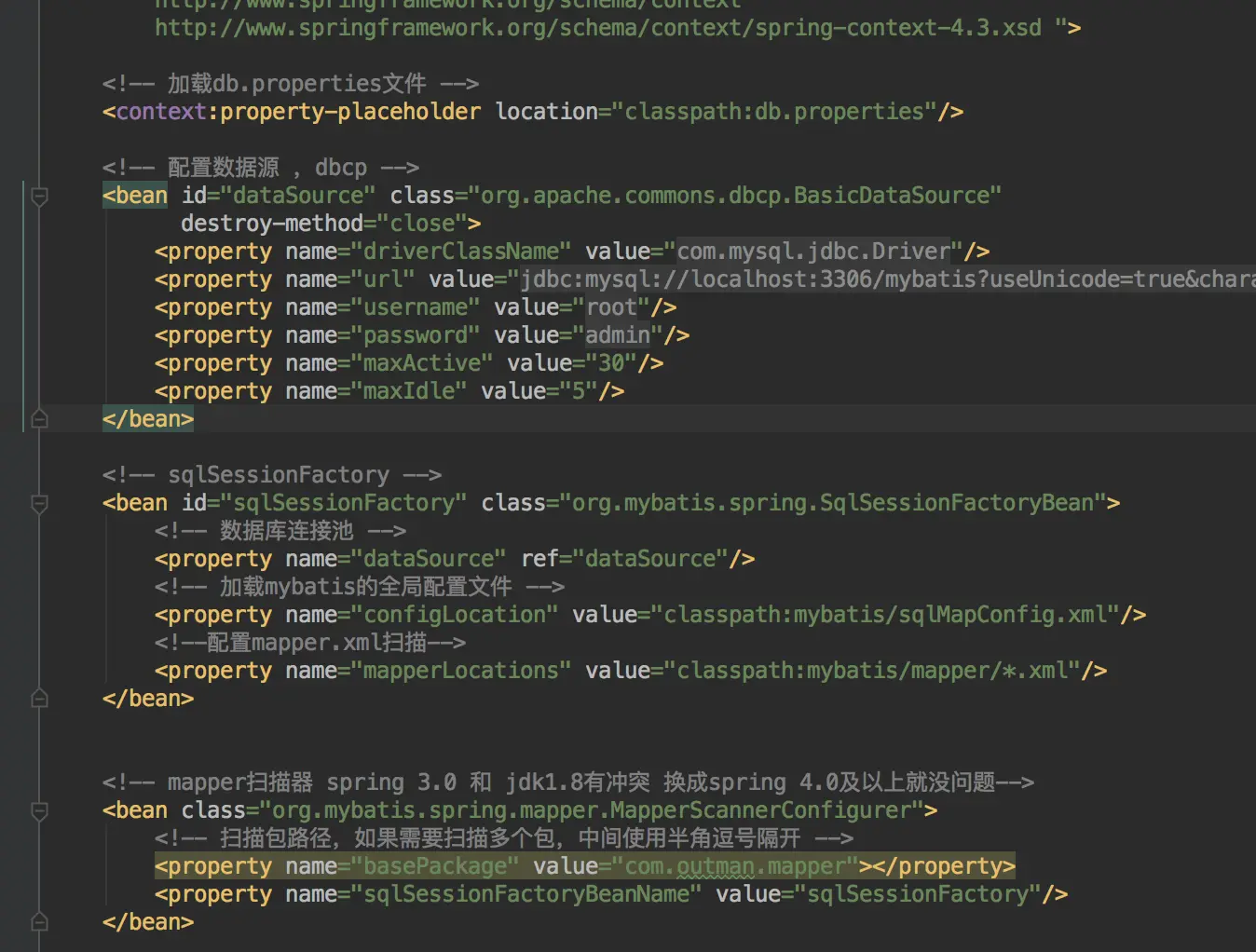 然后在spring目录下新建applicationContext-dao.xml,applicationContext-service.xml,applicationContext-transaction.xml,springmvc.xml配置文件。applicationContext-dao.xml主要配置数据源,sqlSessionFactory和mapper扫描器;applicationContext-service.xml主要是在spring容器中配置service;applicationContext-transaction.xml主要是使用spring声明的事务控制方法;springmvc.xml主要配置处理器,映射器,适配器以及视图解析器等配置。