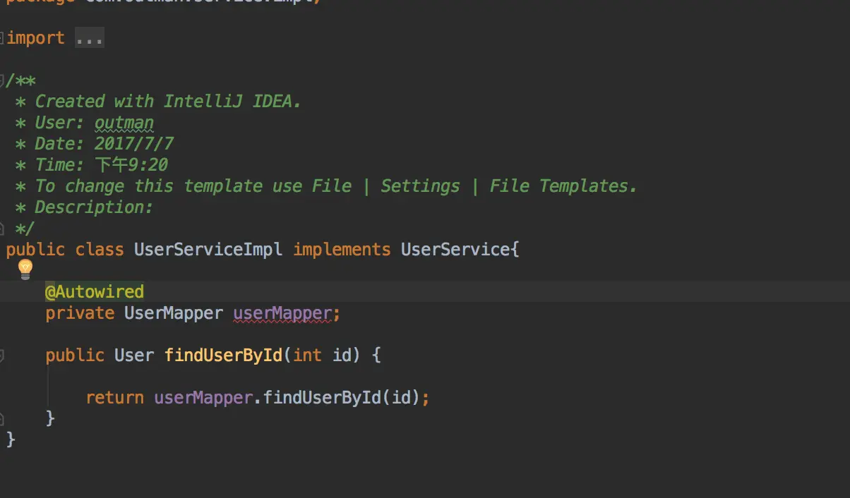 接下来完成service的代码,通过注入的userMapper调用findUserById方法。在controller里面通过注入的service调用findUserById方法,在添加地址映射"/UserQuery"。