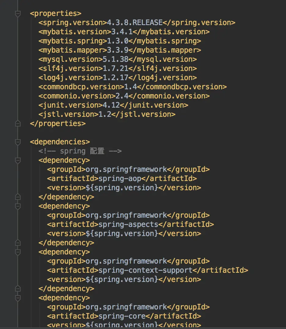 这里我们使用Spring 4.3.8和Mybatis 3.4.1。对于如何寻找jar包的版本,可以通过mvnrepository.com/去搜索对应jar包,然后找到想使用的jar包版本。接下来在pom.xml添加依赖,代码如下图: