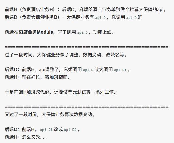 本来前端H是做酒店业务的,为了大保健的推荐列表,不得不因为大保健业务调整,而加班加点。再延伸一下,如果酒店业务H还需要调用电影院列表、美食列表.....每个业务的改动,前端H就呵呵了。