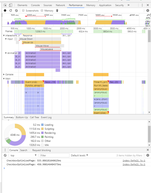 而大部分时间都在播放动画,说明这很有可能是动画导致的卡顿。仔细观察,发现 checkbox 在选中和取消的时候是有动画的,查看 css 代码,果然使用了一个比较复杂的 css 动画。那么继续测试,修改 css 样式去掉它的动画。
