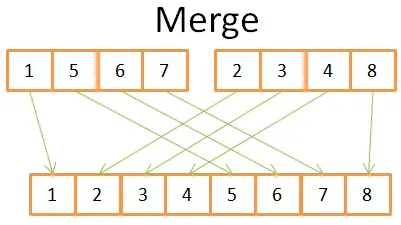 通过此图你可以看到,在 2 个 4元素序列里你只需要迭代一次,就能构建最终的8元素已排序序列,因为两个4元素序列已经排好序了: