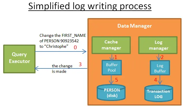 - 4) 接着(不久以后)日志管理器把日志写入事务日志,什么时候写日志由某算法来决定。