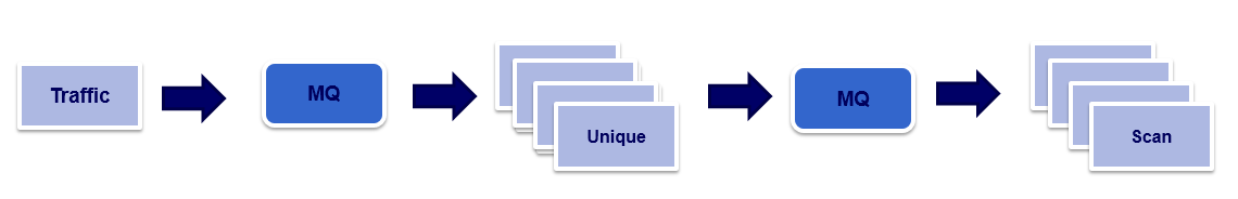 扫描速度也是扫描任务的一个关键指标,在整个架构中,不同的模块之间是通过消息队列进行数据传输的。所以当去重模块或者扫描引擎模块处理速度不够快,造成数据积压时,我们可以通过增加模块实例来进行水平拓展。