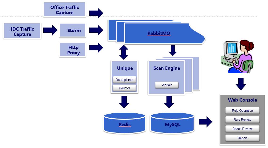 基于以上自动化的安全检测需求,由我们内部研发了Hulk项目,通过网络流量镜像等方式来实现分布式的实时Web漏洞扫描系统。整个项目按模块可分为数据源,数据处理,漏洞检测,漏洞管理等几大模块。