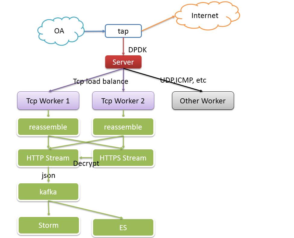 基于网络流量镜像的方式中,需要在办公网到测试环境核心交换机上做流量镜像,通过dpdk、pf_ring等高速抓包模块进行流量获取,并按照五元组信息进行tcp流重组。然后通过http解析器,将其中http请求的请求方法、请求地址、请求域名、请求参数等数据提取成json格式,发送到kafka中。