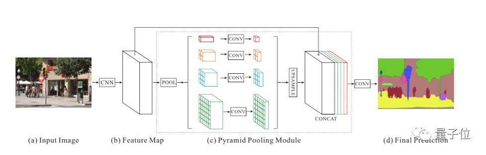 和上文提到的空洞卷积论文一样,PSPNet也用空洞卷积来改善Resnet结构,并添加了一个金字塔池化模块。该模块将ResNet的特征图谱连接到并行池化层的上采样输出,其中内核分别覆盖了图像的整个区域、半各区域和小块区域。
