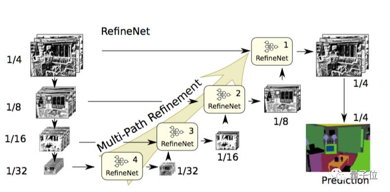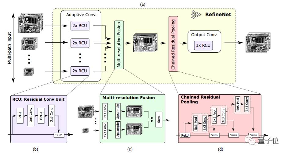 每个RefineNet模块包含一个能通过对较低分辨率特征进行上采样来融合多分辨率特征的组件,以及一个能基于步幅为1及5×5大小的重复池化层来获取背景信息的组件。