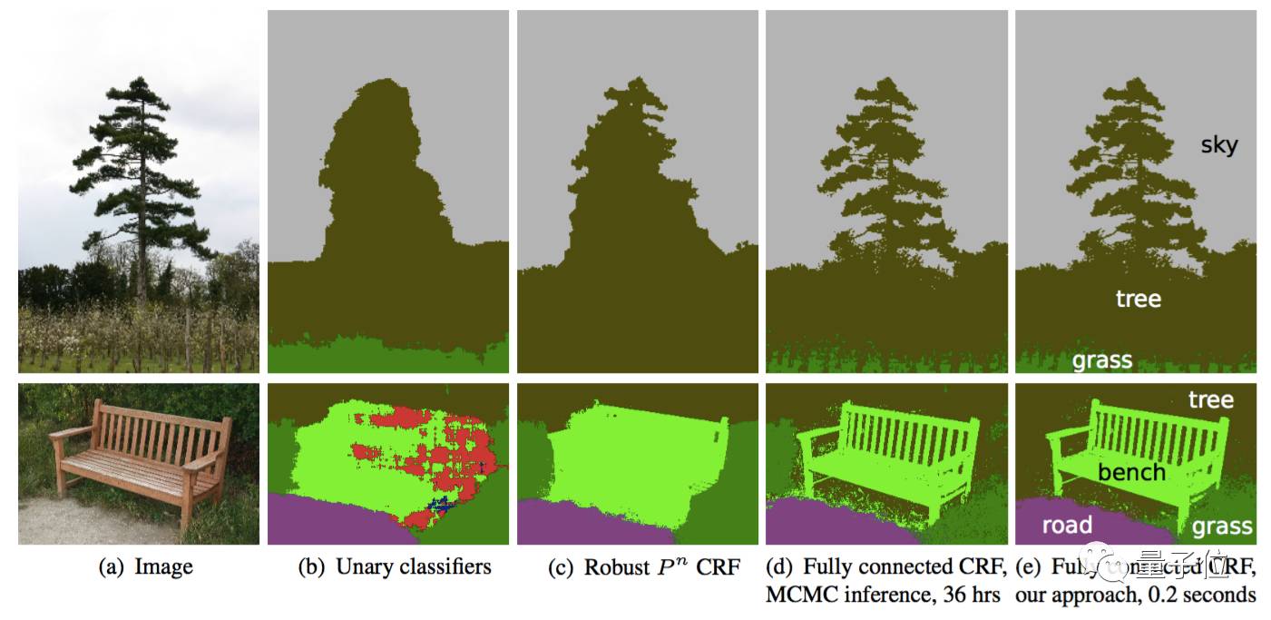 △ 发展中的CRF方法效果。b图中将一维分类器作为CRF方法的分割输入;c、d、e图为CRF方法的三种变体;e图为广泛使用的一种CRF结构。
