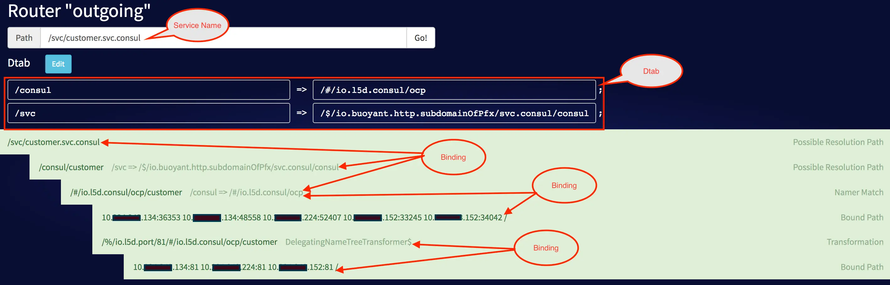 - Delegation Table(a.k.a. Dtab):定义如何把服务名字(service name)(逻辑名字)转换为客户端名字(client name), 客户端名字对应用于服务发现条目,服务发现工具根据这个条目如何发现服务,其必须以/$或者/#打头,如/#/io.l5d.consul/dc/product。