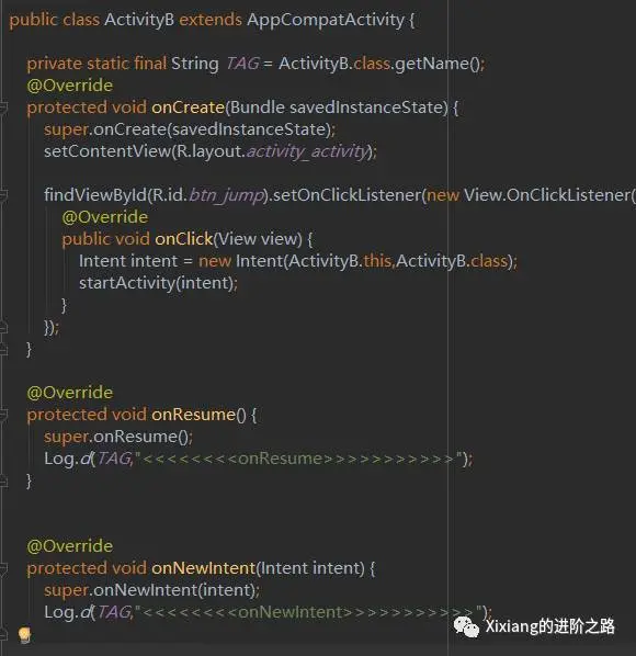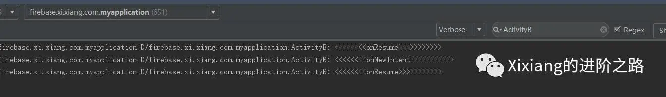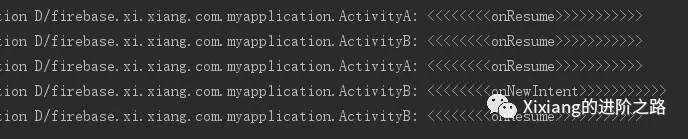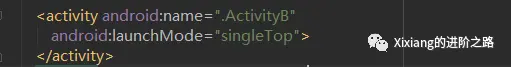 可以看出虽然打开了两次Activity B,但并没有创建两个Activity B实例,所以当启动模式为singleTop的Activity位于栈顶时再次启动会执行onNewIntent方法并重复使用已存在的实例