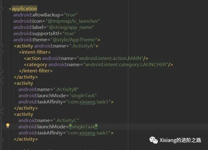 A的启动模式是standard模式,没有设置taskAffinity,系统默认应用包名。由于我们为B和C指定了taskAffinity和启动模式,所以B和C是singleTask模式且具有相同的taskAffinity值为“com.xixiang.task1”,两个Activity处于同一个栈中。A启动B的时候按照singleTask模式规则,这个时候需要为B重新创建一个任务栈名为“com.xixiang.task1”。B启动C,按照singleTask模式规则,由于C所需任务栈和B所需任务栈位于同一任务栈并且栈已经创建,所以无须再创建新的任务栈,这时候系统创建一个新的实例C并将其入栈。接着C再启动A,A是standard模式,所以系统会为它创建一个新的实例并将其加到启动它的任务栈中,由于C启动了A,所以A会进入C的任务栈并位于栈顶,这个时候两个任务栈,一个名字为包名(栈1),一个名字为“com.xixiang.task1”(栈2),栈1中只有Activity A,栈2中为BCA,接下来A再启动B,由于B是singleTask,B需要回到任务栈顶,这时候CA出栈。所以到这里,点击back键的话B就出栈了,B所在的任务栈就不存在了,这个时候只能是回到后台任务栈并把A显示出来。但是现在A所在的栈是后台任务栈,不是B所在的前台任务栈,所以现在继续back键就回到桌面了。你猜对了吗?