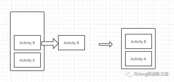 可以看出singleInstance模式具有singleTask模式的特性,不同的是singleInstance模式的Activity会单独开一个新栈,ActivityB单独运行在这个栈中,后续再次打开ActivityB也不会重新创建,除非这个单独的栈被销毁。