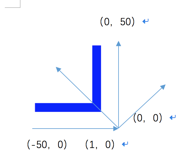 假设三个端点的情况,三个端点 分别是 (-50,0),(0,0),(0,50),现在要计算第二个端点(0,0)对应的两个顶点(第三、第四个),如图: