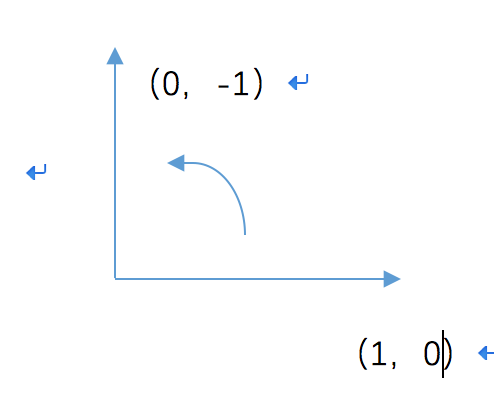 对于第二个顶点,偏移的方向应该是(1,0)顺时针旋转90度,但是前面,我们已经把偏移的基数变成-1了,所以可以认为偏移的方向还是(1,0)逆时针旋转90度,如图: