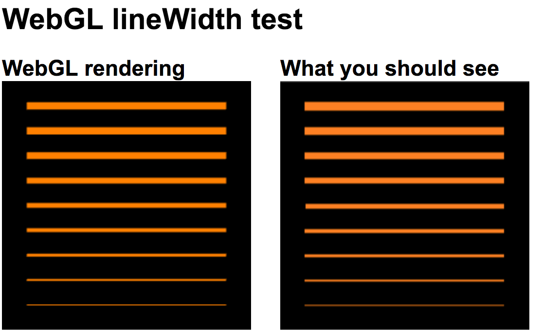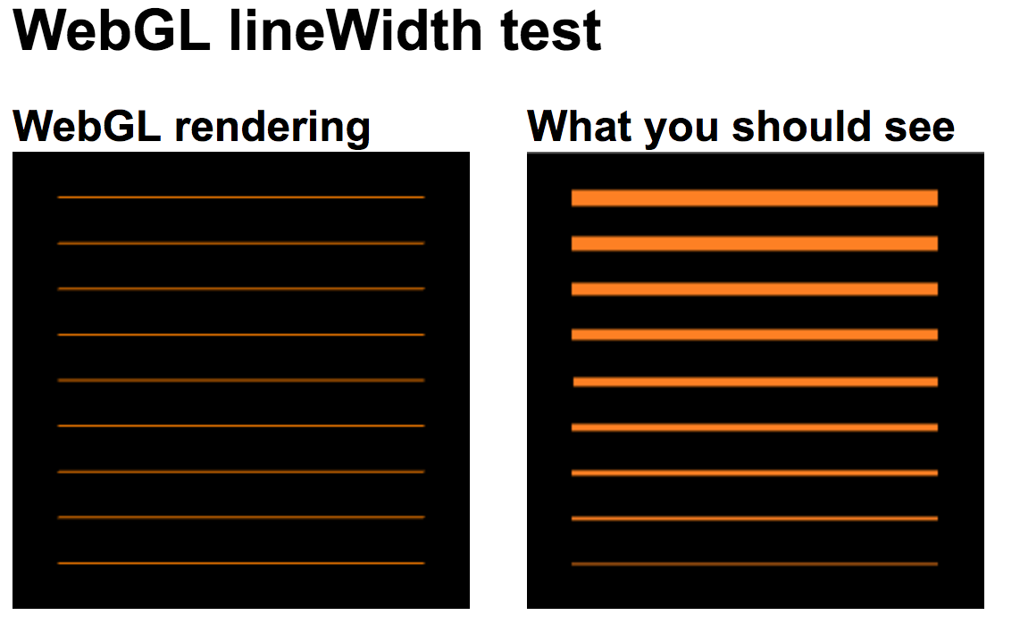 通过网址http://alteredqualia.com/tmp/webgl-linewidth-test/,我们可以测试自己的电脑是否有线宽的不能设置的bug,以下是我的电脑(mac 电脑)用chrome(版本59.0.3071.115)的测试效果:
