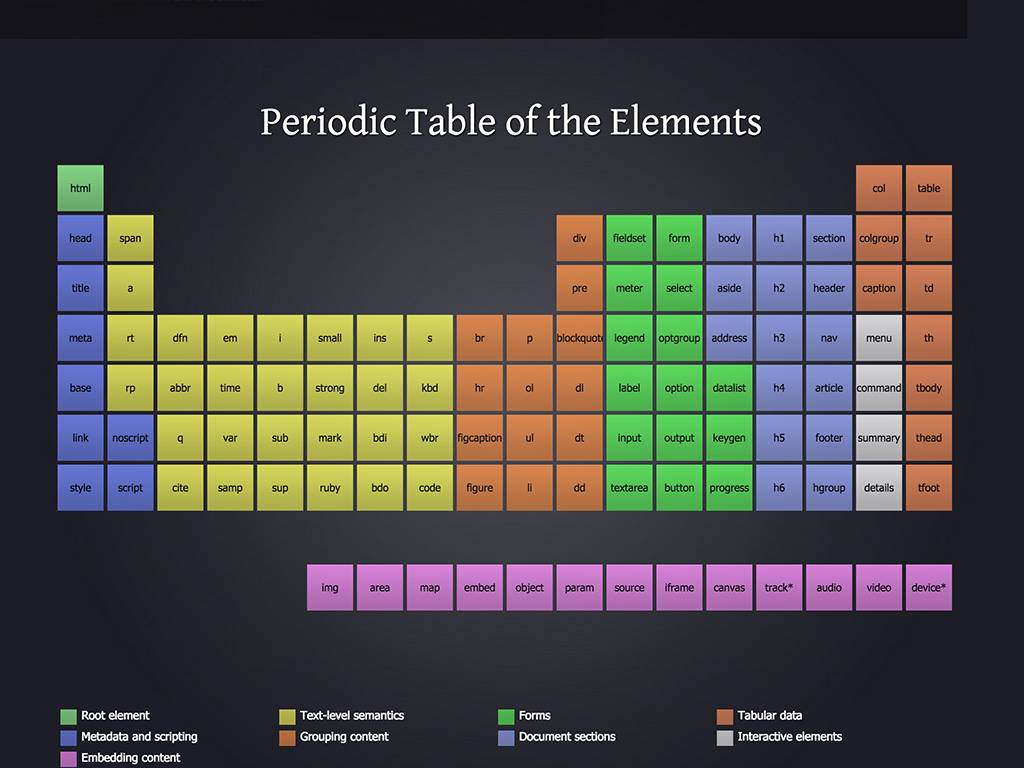 我们之前讨论了为何宇宙中的物质都可以被分解成为原子元素。碰巧的是,我们的界面就是由一些基本的元素组成的。Josh Duck的“HTML元素周期表”完美阐述了我们所有的网站、APP、企业内部网、hoobadyboops等等是如何由相同的HTML元素组成的。