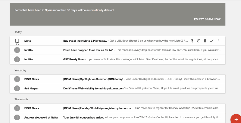 The action “delete” is present on each row. Here the action “Delete” is present on all the rows and seems repetitive on each row. Imagine the same row with five or six options that repeat itself — this would make the table look visually very cluttered. Also, in such a table, it is impossible to delete multiple items at the same time as there is no way to select multiple items.