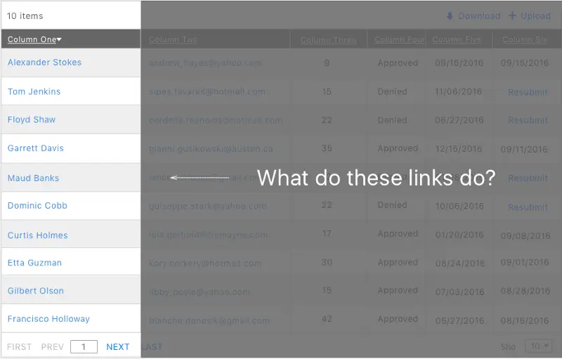 At first, this seems to be some kind of code associated with each row. Placing a link this way does not tell the user what they do. Above is a real example from an enterprise application, where clicking the link copies the code to the clipboard. This action was not very easy to understand and such ambiguous patterns should be avoided.
