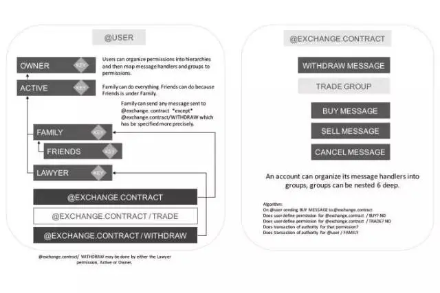EOS.IO软件允许帐户可以定义与其他帐户密钥的“and”和“or”的组合,并且把这个组合以将特定类型的消息发送到另一个帐户。例如,可以为用户的社交媒体帐号提供一个密钥,另一个用于交易。甚至用户可以给予其他帐户许可让其代表自己的帐户行事,而无需向其他帐户分配密钥。